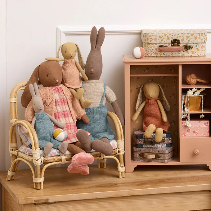 Een klassiek konijntje gemaakt van zachte natuurlijke stoffen die heerlijk aanvoelen en er mooi uitzien. Ze is gekleed in een luchtig zomerjurkje en een zacht schoentje. Bekijk onze kledingcollectie om de garderobe van het konijntje uit te breiden.