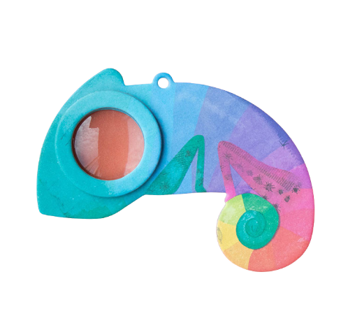 Een loep in de vorm van een kameleonillustratie om alles groter te zien. Een klassiek kinderspeeltje om het gezichtsvermogen te stimuleren. Een ideaal klein cadeautje.