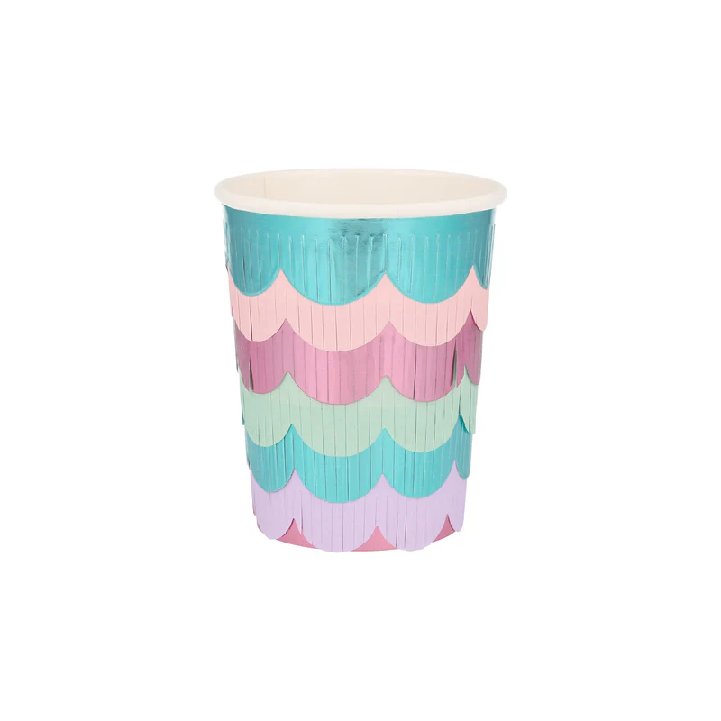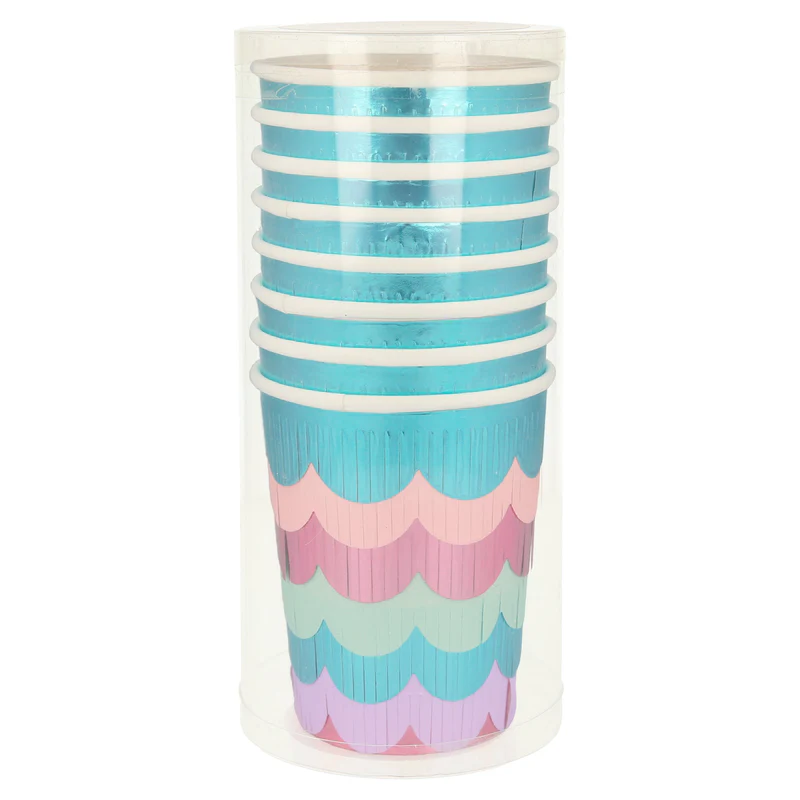• Deze prachtige bekers zijn perfect voor een zeemeerminnen- of onderwaterfeestje. Ze zijn ontworpen om eruit te zien als de glinsterende staart van een zeemeermin, met 6 stroken geschulpte foliefranjes die over elkaar heen zijn gelegd voor een leuk effect.